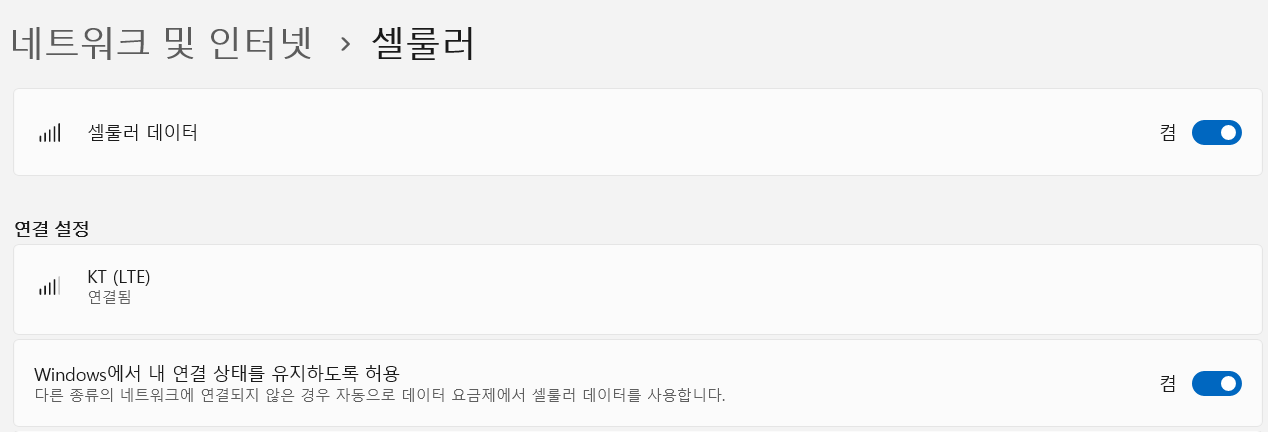 6. 윈도우 설정 - 네트워크 - 셀룰러 메뉴가 활성화되는지 확인한다.